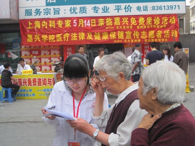志愿者们在药店前设立医疗法律及健康保健的咨询点,替居民们解疑答惑,分发医疗法律和夏季养生保健方面的宣传单,并进行“嘉兴市居民及外来务工人员的医疗法律知识状况”的问卷调查,得到了当地居民的热情支持与配合。