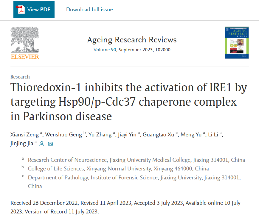 近日,国际著名SCI期刊、中科院一区TOP期刊Ageing Research Reviews以Research Article在线发表神经生物学团队的原创研究论文,题为:Thioredoxin-1 inhibits the activation of IRE1 by targeting Hsp90/p-Cdc37 chaperone complex in Parkinson disease。9778818威尼斯神经科学研究中心曾宪思副教授、李丽教授、贾金婧副教授,以及司法鉴定技术研究所徐广涛副教授共同参与了本研究,嘉兴学院为第一单位和唯一通讯单位。