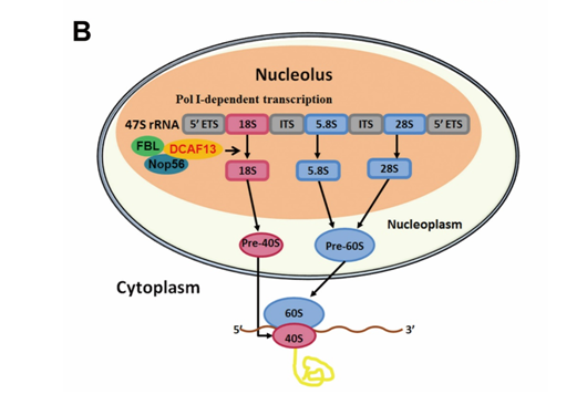 张银丽研究员提出了DCAF13除了常见的泛素化功能外的另一作用新形式——参与调控rRNA前体的剪切和核糖体小亚基的组装。通过其C末端的SOF1结构域结合核糖体RNA前体(pre-rRNA),和其他重要核糖体蛋白如fibrillarin、NOP56相互作用,从而参与pre-rRNA的剪切和核糖体小亚基的组装。张老师研究发现,敲除Dcaf13的卵母细胞中由于无法积累足够的rRNA和核糖体,使得细胞中整体蛋白合成水平下降,进一步影响发育成熟并排卵、受精的潜能。