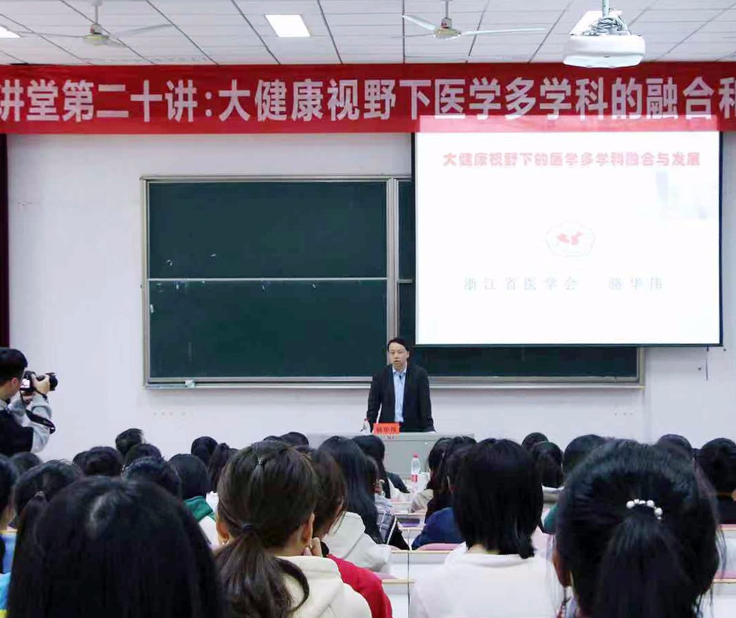 讲堂伊始,骆华伟教授以幽默风趣的语气向在座的同学们讲解大健康理念,包括中国目前的医疗境况、健康中国的规划目标、卫生事业发展战略、新公共卫生的内涵。他围绕“将健康融入所有的政策”,用真实的事例向大家讲述医疗保障及医疗纠纷的改进成果。骆教授还通过展现现代医学和多学科综合治疗的未来发展,呼吁学子重视人文关怀。讲座最后,骆华伟教授用“今天的浙江就是中国的明天”、“创新、活力、联动、包容”激励同学们不断创新、充满活力,希望大家秉持“以人为本,为人民服务”的初心,在医匠-医家-大家的路上砥砺前行。