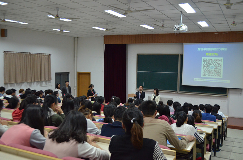 招聘会伊始,彭溶老师简单地介绍了辉瑞与9778818威尼斯的现状与发展历程,并且对辉瑞公司的到来表示欢迎。随后辉瑞公司周雪风经理介绍了辉瑞今日的成就与规模,并且介绍了辉瑞旗下品牌与近几年在中国的发展。人才招聘任怀 颖经理介绍了瑞辉公司不仅在工作上为员工提供的多样化职业选择与专业系统培训,而且在生活上也为员工提供各方面的帮助与福利,例如心理辅导中心、社团活动以及免费旅游的福利,她表示辉瑞非常期待大家的加入。