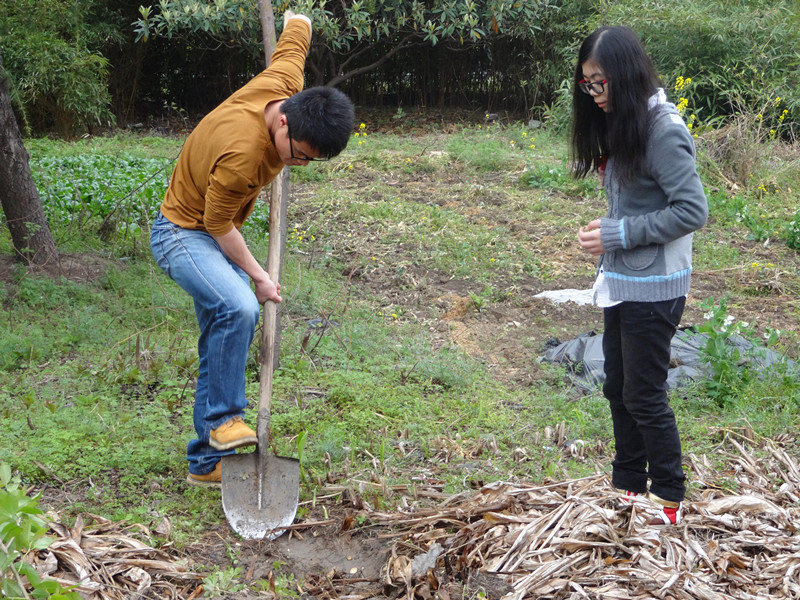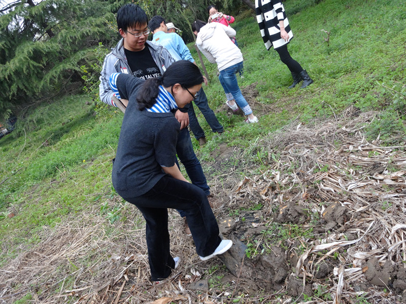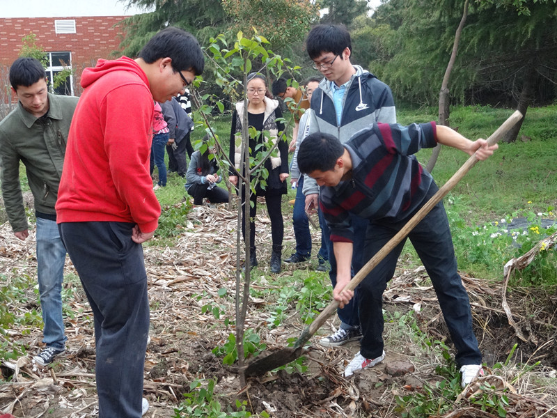 伴随着当天下午的绵绵细雨,怀着一份寄予母校浓厚爱的情意,我们拿起铁铲和杏树苗,在这片孕育我们成长的土地上,种下我们的感恩之心。雨欲见下大,但是我们毫不退缩,挥铲、推土动作一步到位,只见一颗颗小杏树苗挺拔的站立在我们面前。最后,在老师和同学们的齐心协力下,育林活动顺利完成。随后,大家分别和小树进行合影,并在各自种的小树苗上挂上了先前特意制作的标识牌,以待今后返校之时能认出曾经自己亲手种下的它。