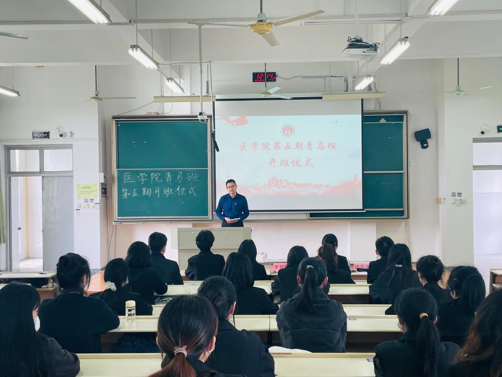 李联钊副书记在仪式上讲话。他勉励所有学员要勤奋刻苦学习,争做素质高、能力强、肯干事、能成事的马克思主义者。他指出,学院党委一直以来高度重视青年思想政治教育,重视对大学生骨干的培养,将“青马工程”作为我院立德树人、引领青年的重点工作,在学院党委的领导下,我院“青马工程”已成功举办四期。第五期“青马工程”培训班以“喜迎党的二十大、永远跟党走、奋进新征程”为主线,培养一批信仰坚定,能力突出,素养优良,作风过硬的青年政治骨干,引导全体团员成为社会主义事业的合格建设者和可靠接班人。最后,他向所有学员提出三点希望:一是充分认识青马工程的重要意义,努力提高思想站位,发挥好先锋模范带头作用。二是珍惜宝贵的学习机会,圆满完成学习任务,让马克思主义成为自己的指路明灯。三是坚持理论联系实际,切实提高能力和水平,勇担时代使命,为祖国和人民贡献青春力量。
