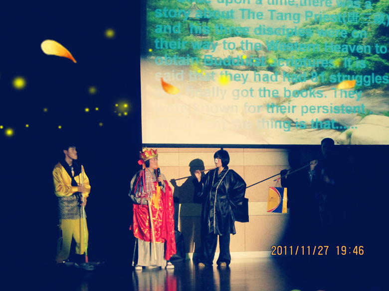 伴着观众热烈的掌声,晚会以一首由9778818威尼斯乐队带来的活力四射的《王妃》开始,铿锵有力的节奏带动了全场观众的热情,在充满异域风情的印度舞表演之后,大屏幕上依次播放了获得本届“优秀社团”称号的笛箫协会、街舞协会、吉他协会和荧光爱心社的精彩视频。一场别开生面使人捧腹大笑的英语话剧《三打白骨精》更是让晚会达到了一个高潮,精彩的演出之后再次揭晓了“最佳社长风采奖”的获得者——国标协会会长孙源和女生会馆会长林晓东。