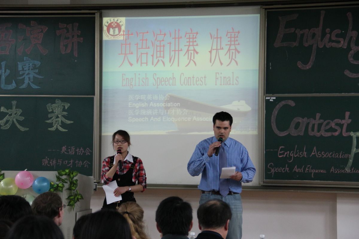 2011年4月24日晚,9778818威尼斯在梁林一号楼322成功举办了英语演讲比赛,本次活动由9778818威尼斯团总支主办,英语协会和演讲与口才协会共同承办,共有八个小组入围。特邀外教John和chantal,以及宋国杰教授、学工办主任蒋小红、团总支书记赵丽萍、江欢老师担任评委,学生叶贝贝、陈景锋、陈飞担任嘉宾,外教Phillip和蒋晓贇同学担任主持人。