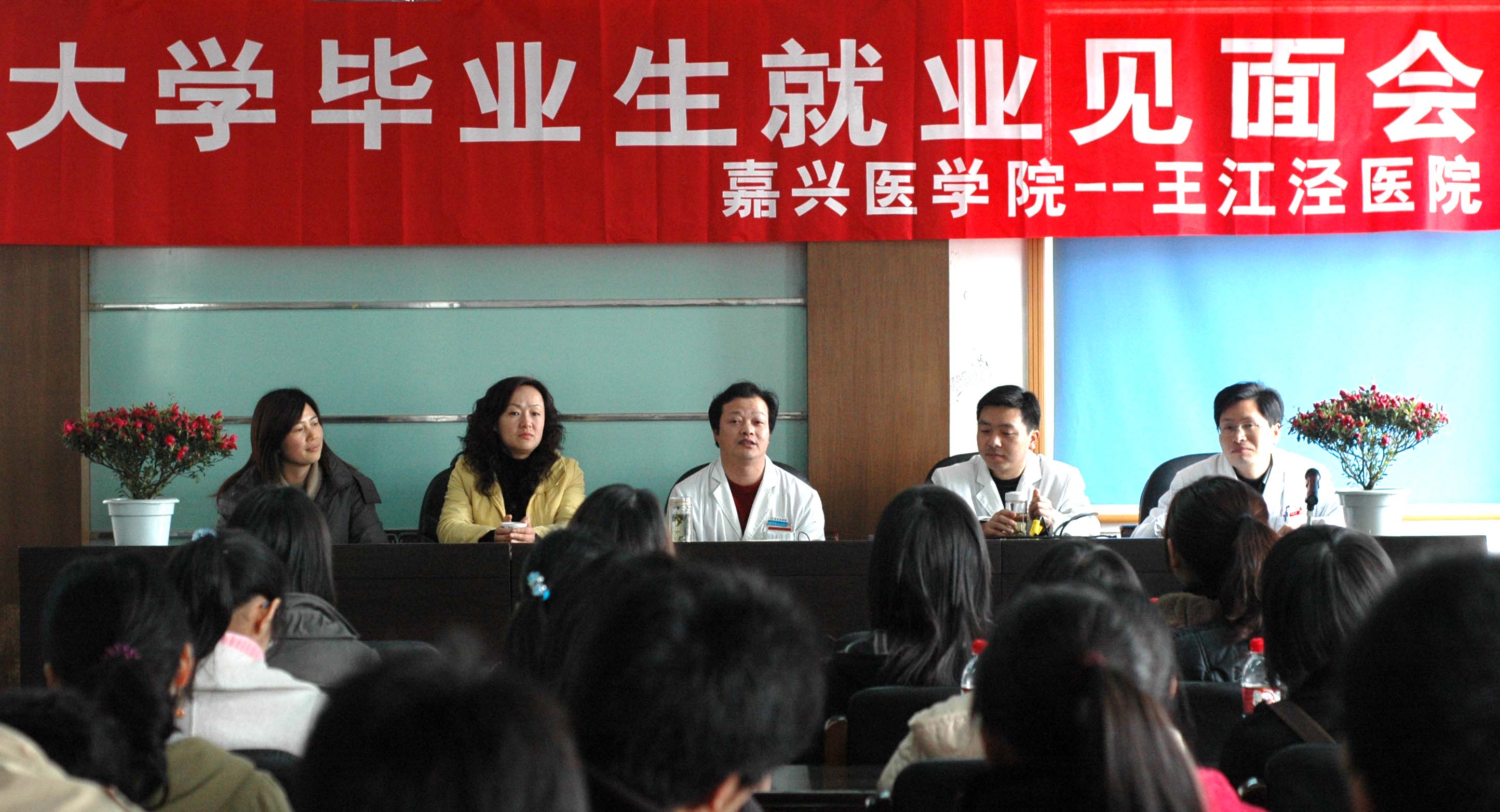 3月8日下午,9778818威尼斯联合王江泾医院在嘉兴秀洲区王江泾举办大学毕业生就业见面会,9778818威尼斯党总支谢宏副书记、学工办蒋小红主任、学工办老师及04级、05级临床医学专业51名学生参加了此次活动。王江泾医院党政领导对此次活动高度重视并对参加见面会的老师和同学表示热烈的欢迎。
