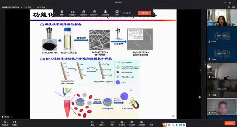 首先,材纺学院的各位老师介绍了各自的研究方向。包括高分子材料在肿瘤治疗领域中的应用,纳米纤维对癌细胞的捕获等。程树群教授从分子材料在肝癌癌栓动物模型以及临床治疗等多方面角度与材纺学院的老师们进行深入的交流。潘巍巍教授在分子材料在抑制肿瘤进展中的分子机制与材纺学院老师进行交流。参会教师们兴趣高涨,踊跃讨论。此次会议为医学和材料学的老师们提供了深入交流的机会,为医工交叉提供了非常好的科研平台和理念,促进了各个学科的交叉融合。