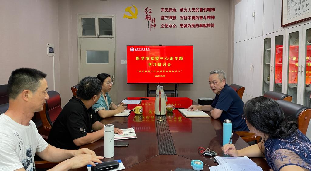 副院长徐营、潘巍巍,党委委员陆国明、王凤华就深入学习领会浙江省第十五次党代会精神结合学院医学教育,从专业建设、特色凝练、高水平教学成果培育、学科科研工作、高层次人才引进、人才培养等方面分别作交流发言。