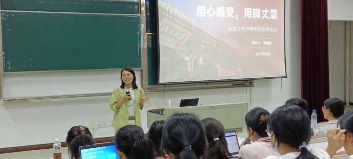 2022年9月15日,护理系徐鋆娴老师在7号楼报告厅为9778818威尼斯护理学系师生带来“用心感受,用脚丈量——北京大学护理学院访学见闻分享”报告会。护理学系全体教师及护理学专业2020级、2021级学生到场聆听,2022级学生在线同步参加了分享会。