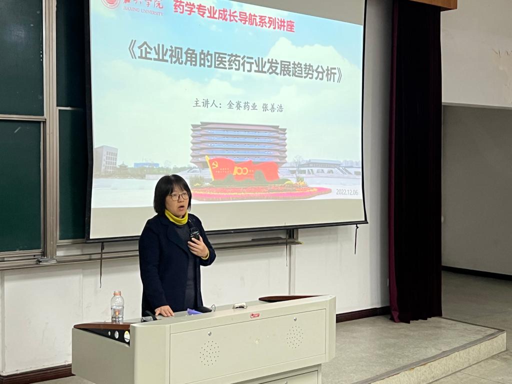 2022年12月6日晚,药学系在7号楼报告厅举行了“成长导航系列讲座”,特邀金赛药业有限责任公司与药学专业同学面对面进行交流。药学系主任黄越燕主持活动,全体药学20级、21级及部分19级学生,以及药学教师代表参加了本次活动。