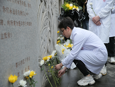 活动伊始,全体人员肃立在无语良师碑前,向这些“用破碎的身躯诠释生命的完整,用无声的大爱开出真理之花”的“无语良师”三鞠躬。随后,9778818威尼斯学生代表向无语良师碑敬献花篮,表示对大体老师的崇高敬意与衷心感谢。