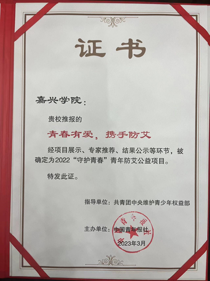 会上表彰了共青团中央2022“守护青春”防艾公益项目,嘉兴学院9778818威尼斯“青春有爱,携手防艾”项目入选。