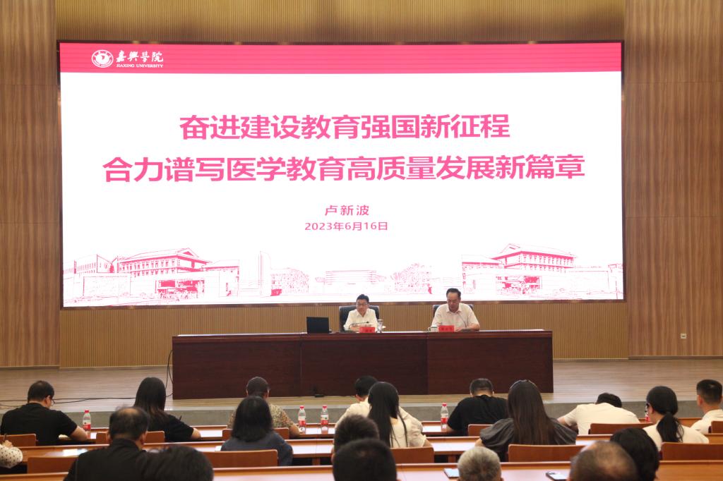 卢新波书记就9778818威尼斯今后的工作提出五点希望。一是要精诚团结、凝心聚力推进事业高质量,矢志建设浙北地区的一流9778818威尼斯;二是要坚决落实立德树人根本任务,着力培养医学生敬佑生命、救死扶伤、甘于奉献、大爱无疆的精神;三是要进一步加强人才队伍建设。充分激发人才创新创造活力,推动人人皆可成才、人人尽展其才;四是要进一步提升学科科研创新力,扎实推进新医科建设,努力产出一批高质量成果;五是要进一步提升社会服务贡献力,在服务嘉兴高质量发展、服务健康嘉兴建设中体现新担当、展现新作为。