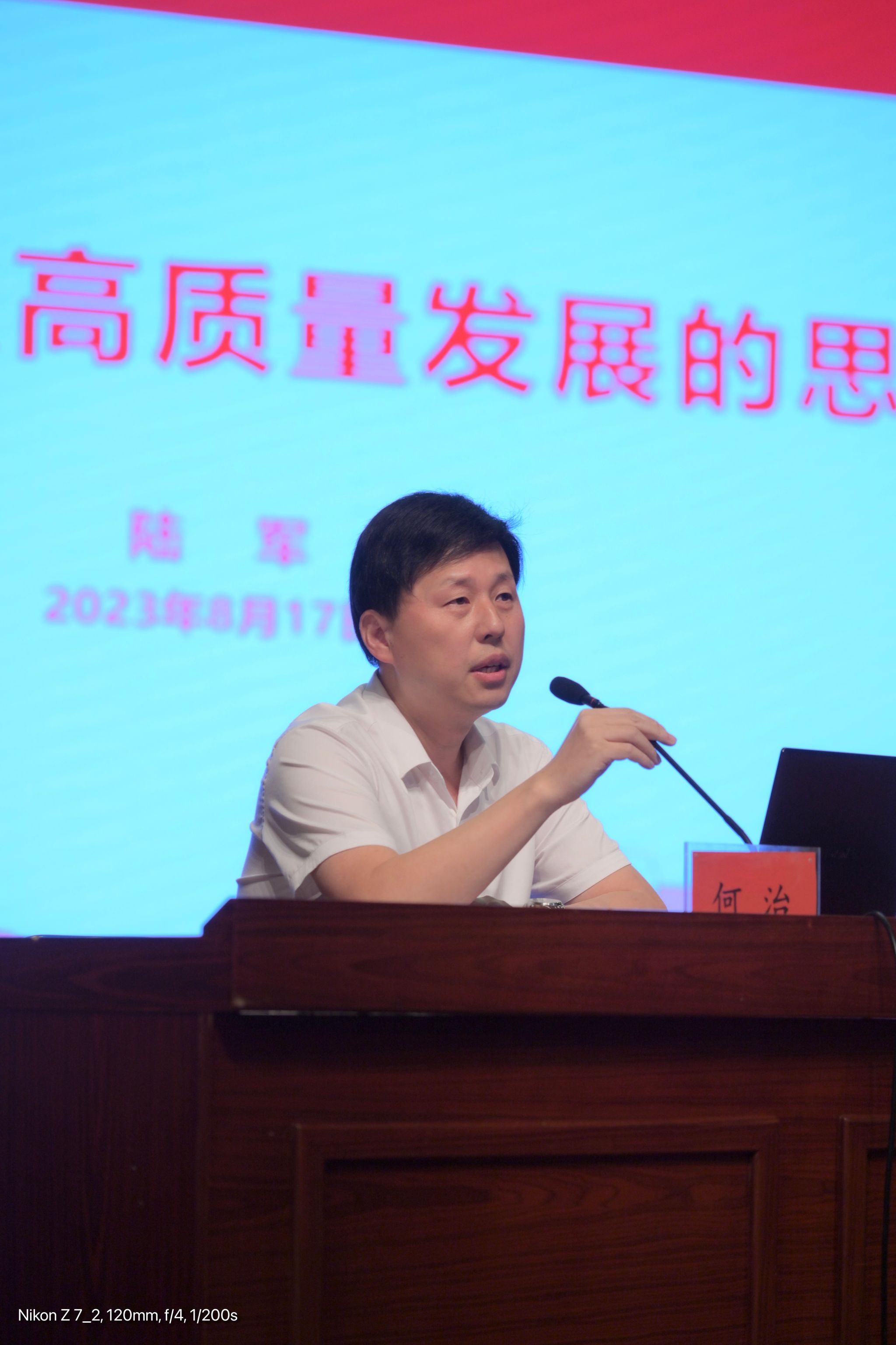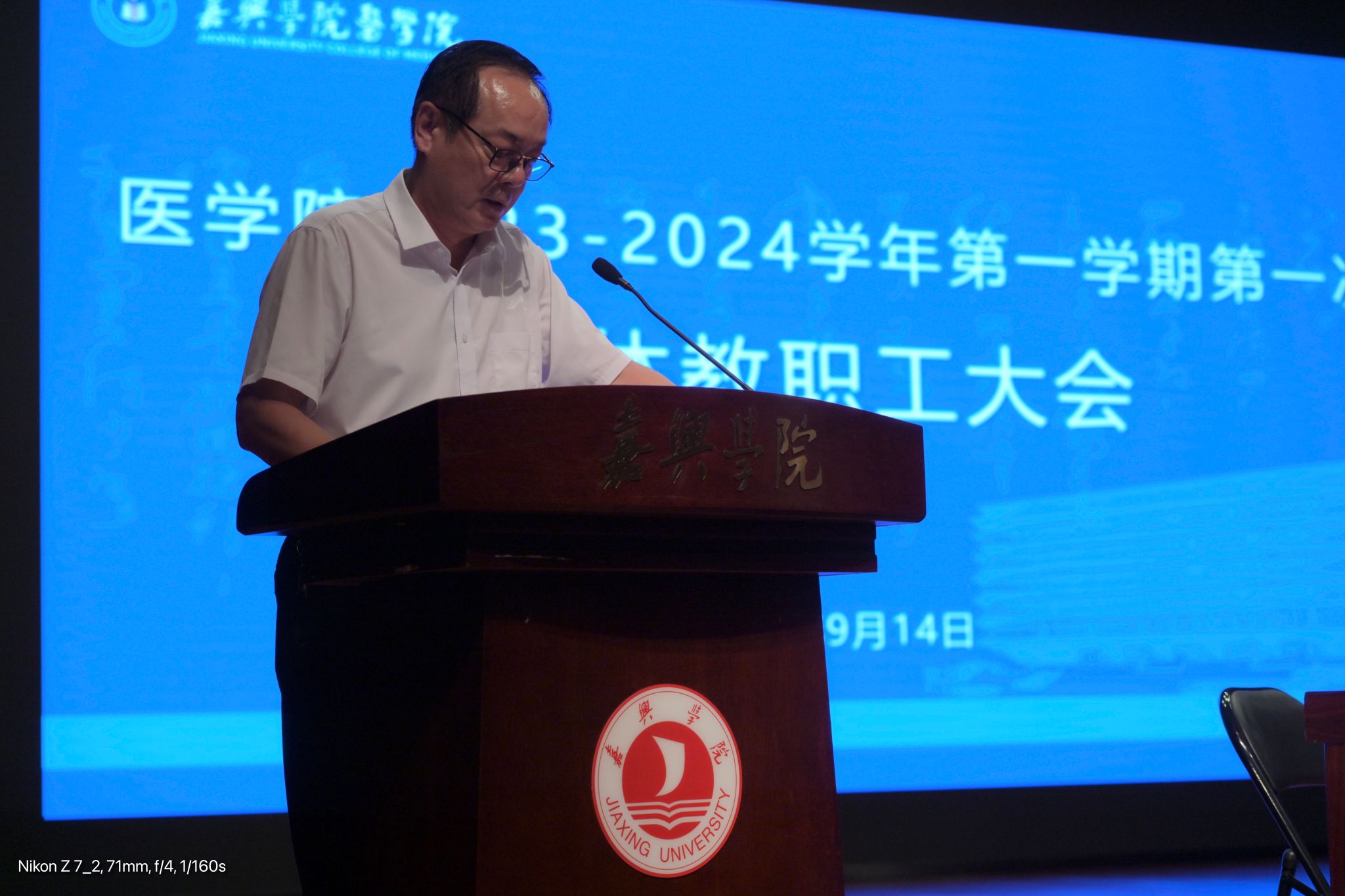 首先,院长何治传达嘉兴学院暑期中层干部读书会上校长陆军院士关于《学校有组织高质量发展的思考》专题辅导报告精神。他强调,全院师生员工要以“努力把学校办成一所有特色、善创新的综合性大学,培养出更多适应经济社会发展需求的高素质人才”为指引,深入实施“1358”战略部署,通过“六减”“六增”改革建设举措,有组织高质量地发展学校各项事业。在学院新学期工作部署会上,院长何治希望全体教职工要“主动求变、主动适应、积极作为”,力争在学科培育、科研团队、师资队伍、专业及课程建设、省级重点实验室、硕士学位授予点、ESI学科排名、直属附属医院建设等方面取得新的突破,科研创新能力显著提高,服务地方卫生健康事业的能力显著增强。他还就学校新一轮本科教育教学审核评估作了动员讲话。