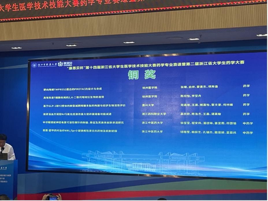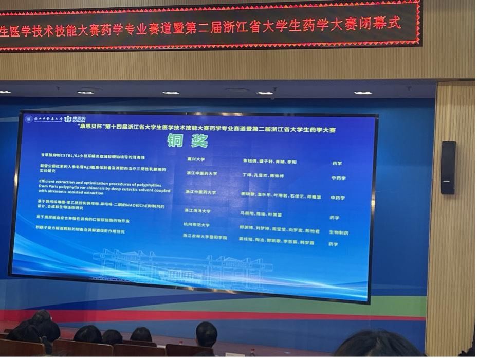 来自浙江大学、温州医科大学、嘉兴大学等高校的数十支队伍参加了大赛,我院和系部精心准备,通过初赛选送科技成果视频的竞争筛选,决赛的实验技能考核和项目汇报,最终药学专业学生团队在本次大赛荣获1银2铜,获奖数量并列全省第二,获奖质量位居全省前列,充分展现了我校药学专业学生的优良精神风貌与综合素质,彰显了学生团队合作和解决问题的能力。