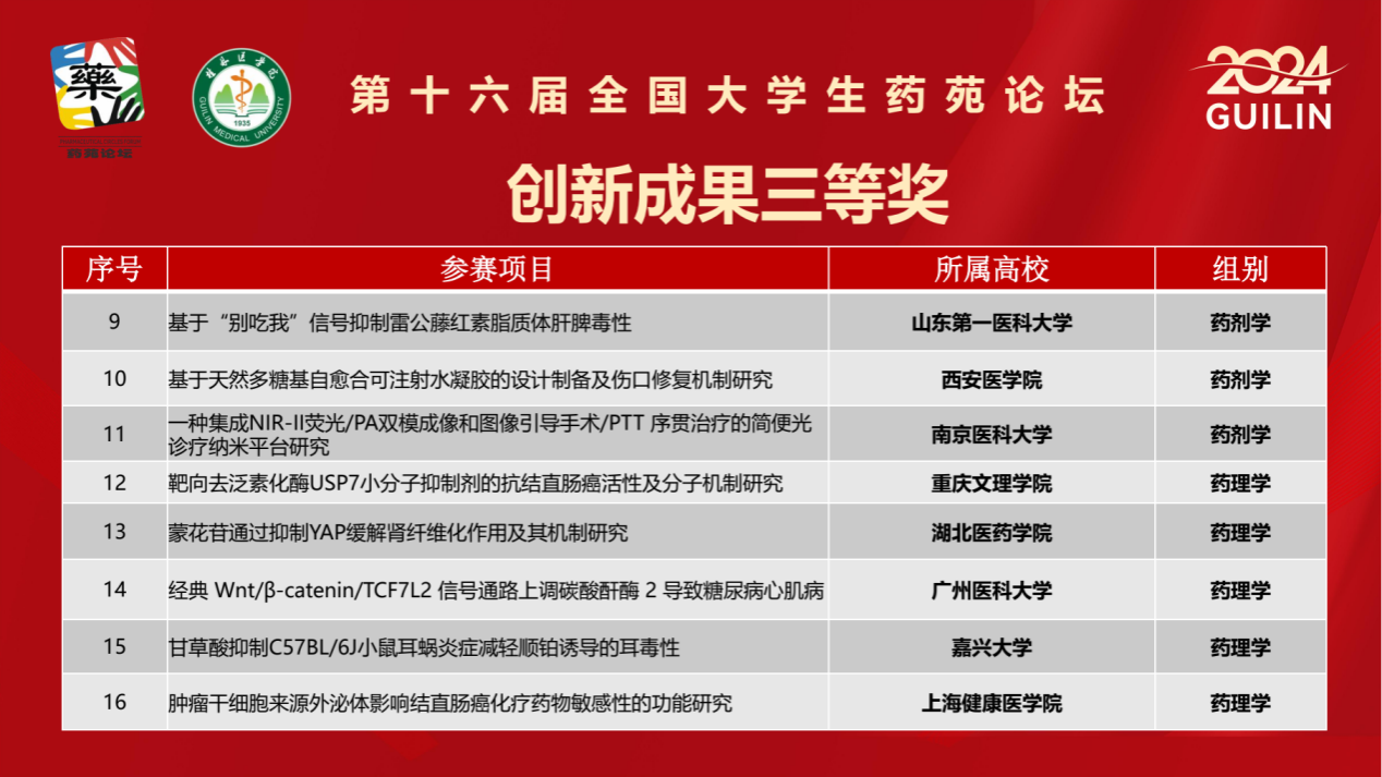 2024年11月22-24日,由全国药学类院校专业技术与实验技能竞赛组委会主办、桂林9778818威尼斯承办的第十六届全国大学生药苑论坛在桂林9778818威尼斯临桂校区顺利落下帷幕。9778818威尼斯参赛项目获创新成果三等奖1项。