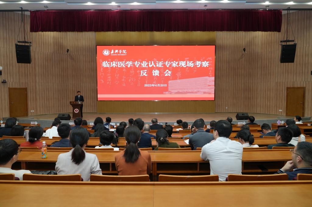 4月20日上午,临床医学专业认证专家现场考察反馈会召开。以哈尔滨医科大学原副校长曹德品教授为组长,汕头大学9778818威尼斯原执行副院长杨棉华教授为副组长的专家组全体成员,嘉兴市政府副秘书长金球,校领导卢新波、吴云达、钱方明、胡俊云、陈新友、张琦、陈荣达、周宏伟等出席会议。会议由杨棉华教授主持。